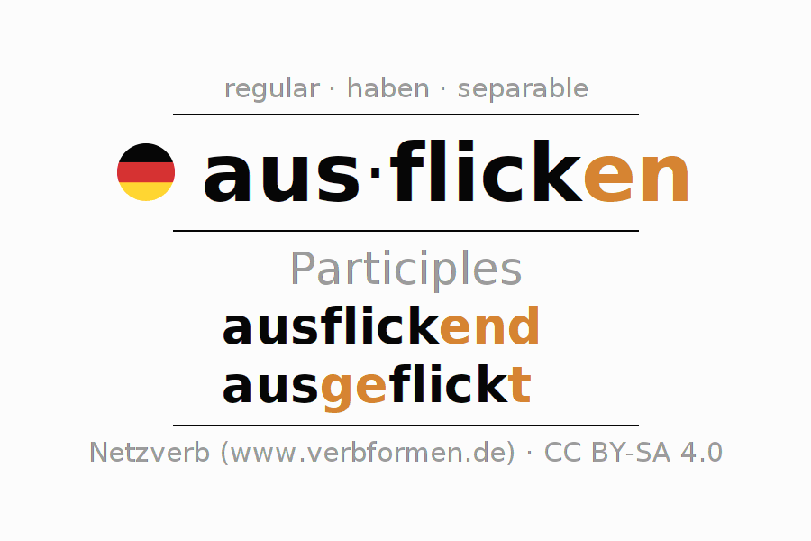 The verb ausflicken fully conjugated in all persons and numbers in the Participle Present Perfect
