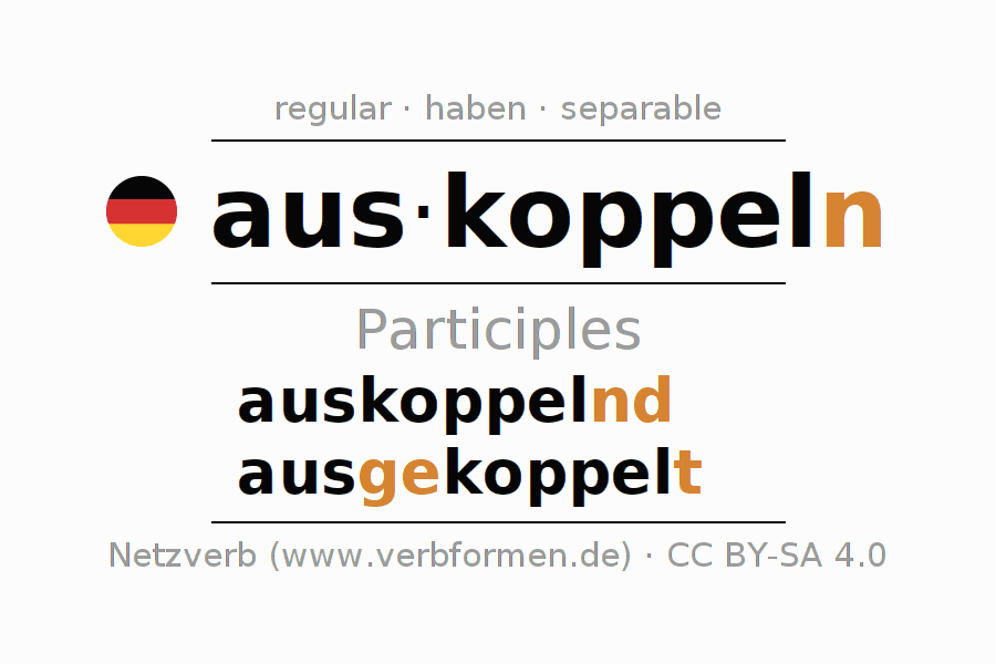 The verb auskoppeln fully conjugated in all persons and numbers in the Participle Present Perfect