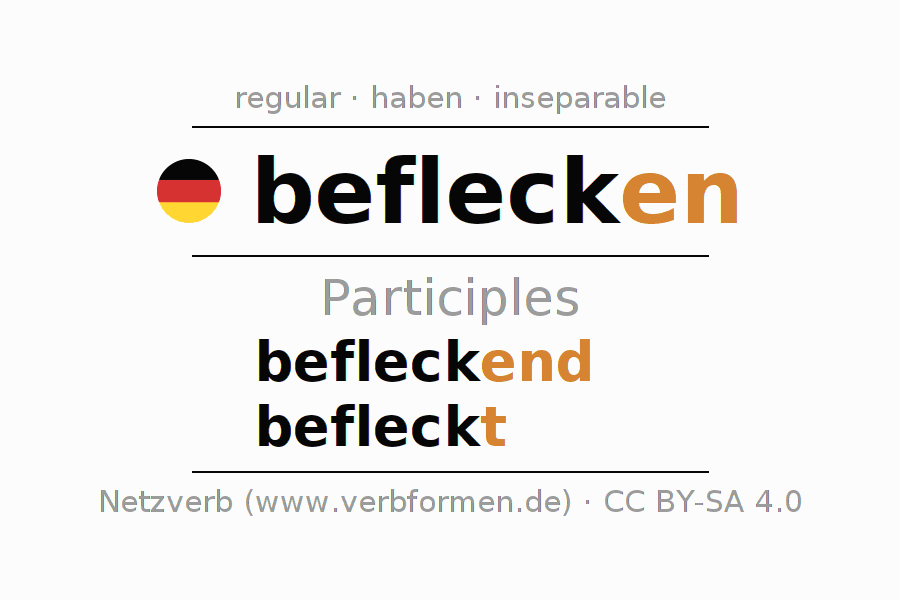 The verb beflecken fully conjugated in all persons and numbers in the Participle Present Perfect
