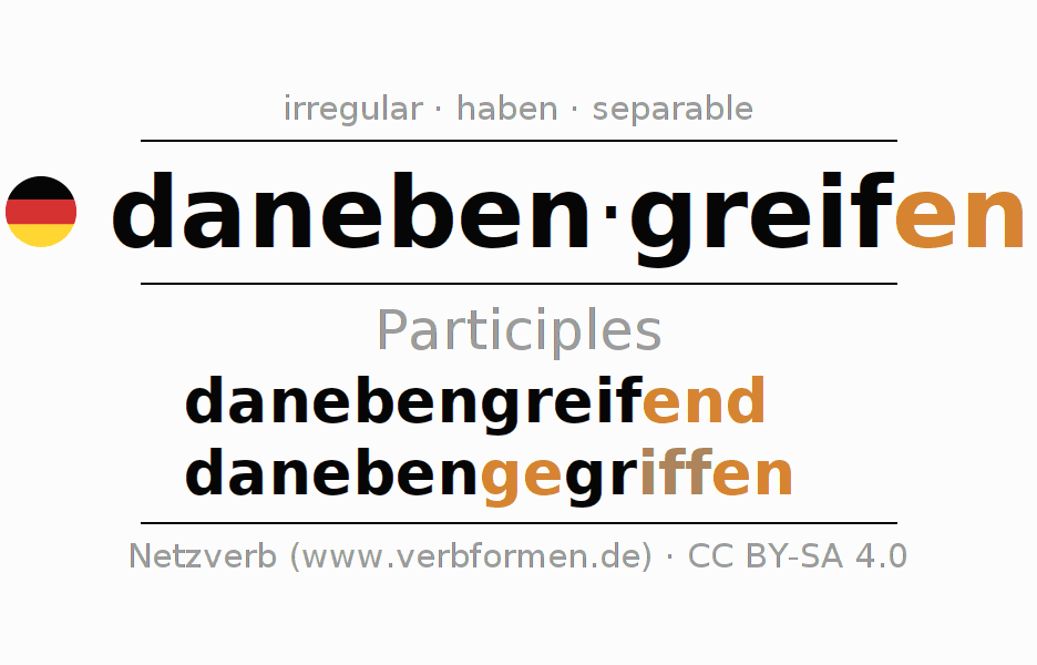 The verb danebengreifen fully conjugated in all persons and numbers in the Participle Present Perfect