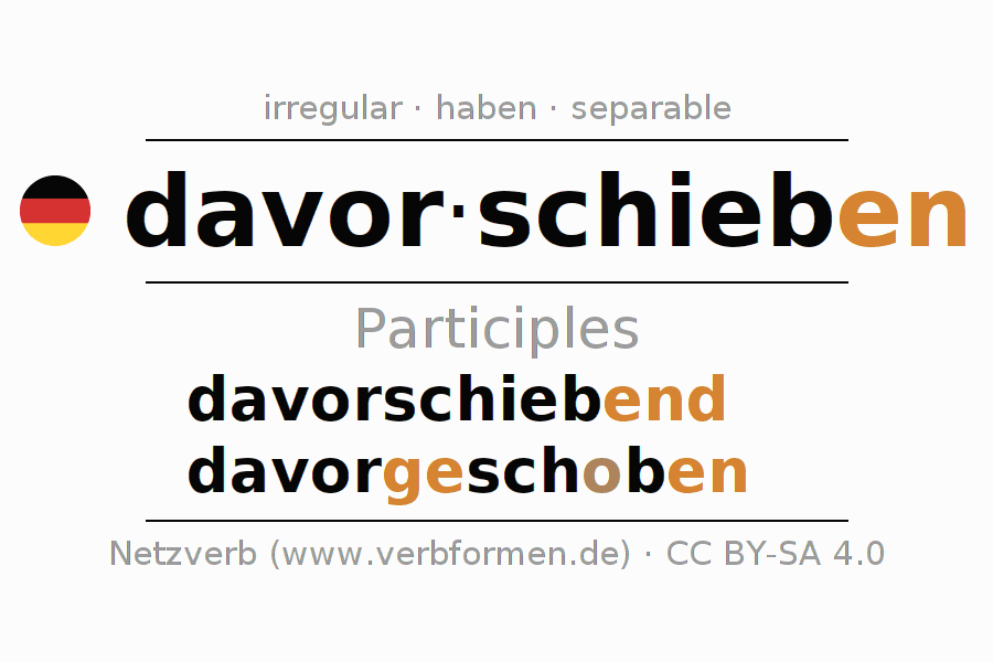 The verb davorschieben fully conjugated in all persons and numbers in the Participle Present Perfect