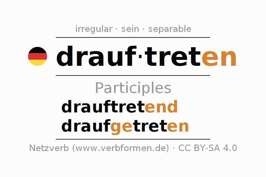 The verb drauftreten fully conjugated in all persons and numbers in the Participle Present Perfect