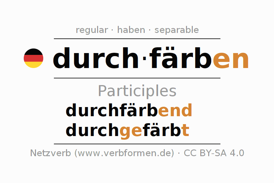 The verb durchfärben fully conjugated in all persons and numbers in the Participle Present Perfect