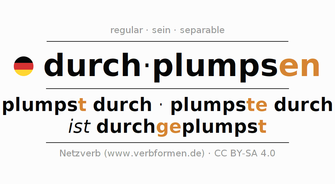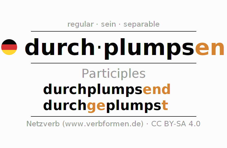 The verb durchplumpsen fully conjugated in all persons and numbers in the Participle Present Perfect