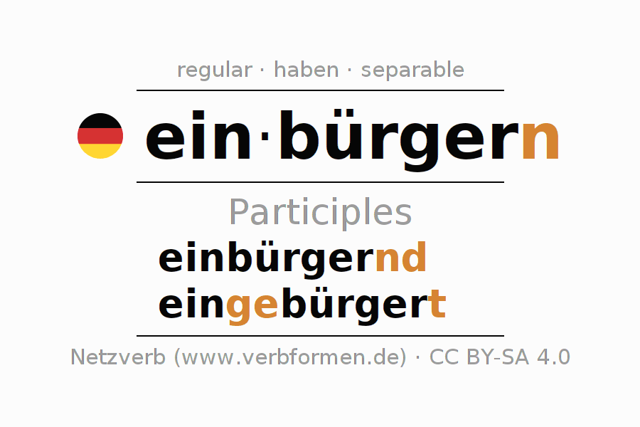 The verb einbürgern fully conjugated in all persons and numbers in the Participle Present Perfect