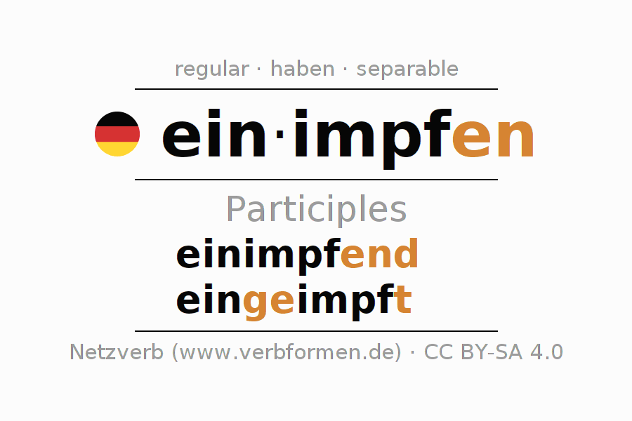 The verb einimpfen fully conjugated in all persons and numbers in the Participle Present Perfect