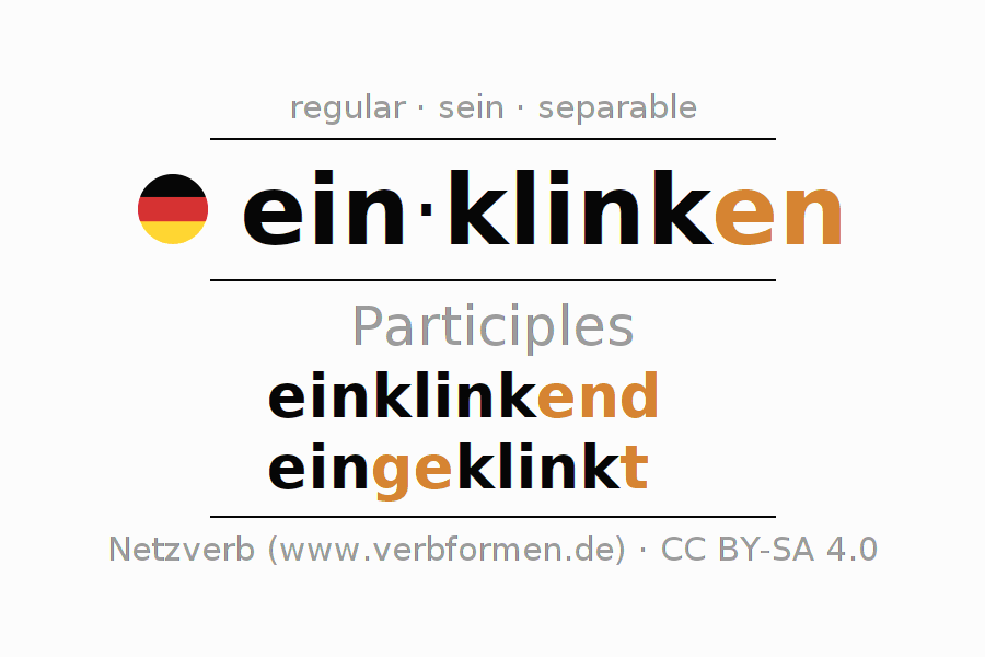 The verb einklinken (ist) fully conjugated in all persons and numbers in the Participle Present Perfect