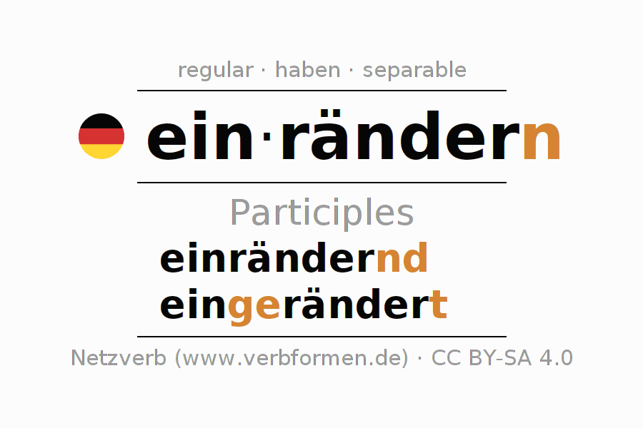 The verb einrändern fully conjugated in all persons and numbers in the Participle Present Perfect