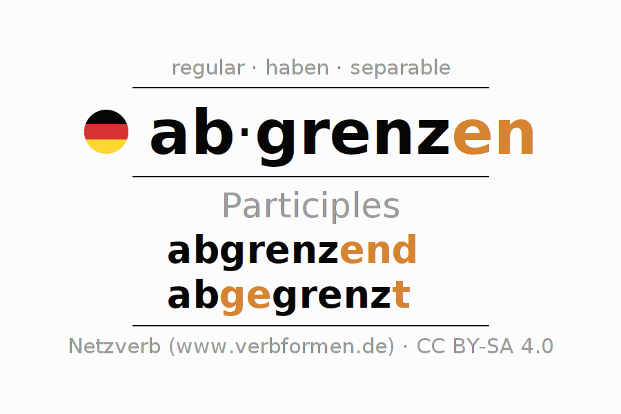 The conjugation of abgrenzen in Participle Present Perfect part of speech Active is abgrenzend, abgegrenzt.The conjugation corresponds to certain grammatical rules. Likewise the requirements for the conjugation of the simple verb forms of abgrenzen in Participle. Comments ☆