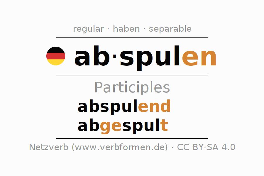 The conjugation of abspulen in Participle Present Perfect part of speech Active is abspulend, abgespult.The conjugation corresponds to certain grammatical rules. Likewise the requirements for the conjugation of the simple verb forms of abspulen in Participle. Comments ☆