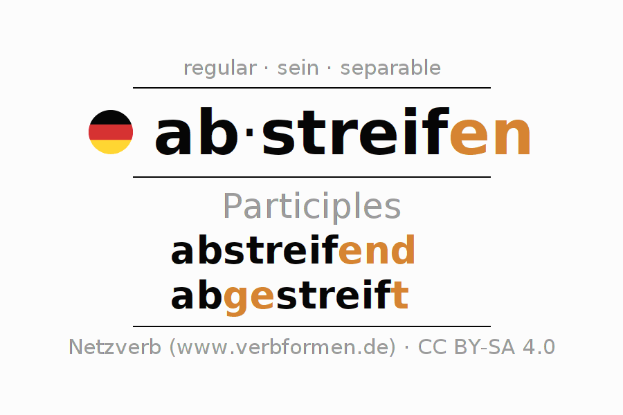 The conjugation of abstreifen in Participle Present Perfect part of speech Active is abstreifend, abgestreift.The conjugation corresponds to certain grammatical rules. Likewise the requirements for the conjugation of the simple verb forms of abstreifen in Participle. Comments ☆