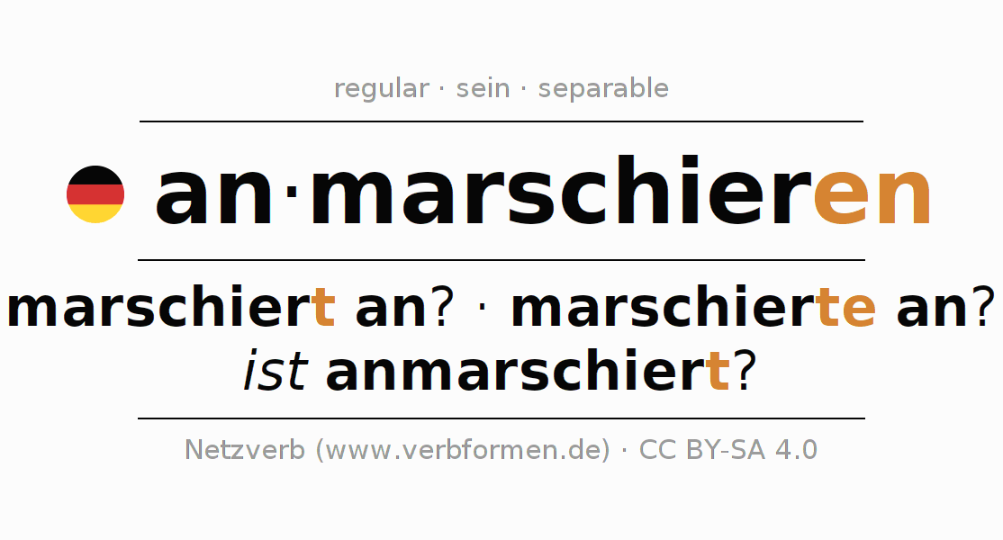 The conjugation of anmarschieren in Participle Present Perfect part of speech Active is anmarschierend, anmarschiert.The conjugation corresponds to certain grammatical rules. Likewise the requirements for the conjugation of the simple verb forms of anmarschieren in Participle. Comments ☆