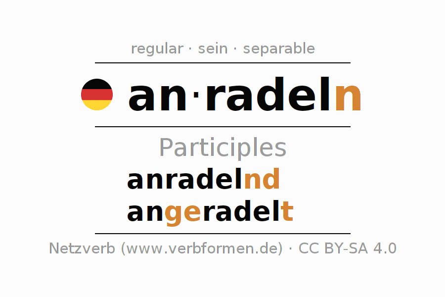 The conjugation of anradeln in Participle Present Perfect part of speech Active is anradelnd, angeradelt.The conjugation corresponds to certain grammatical rules. Likewise the requirements for the conjugation of the simple verb forms of anradeln in Participle. Comments ☆