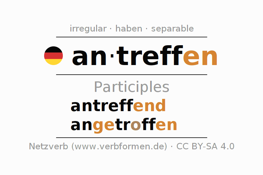 The conjugation of antreffen in Participle Present Perfect part of speech Active is antreffend, angetroffen.The conjugation corresponds to certain grammatical rules. Likewise the requirements for the conjugation of the simple verb forms of antreffen in Participle. Comments ☆