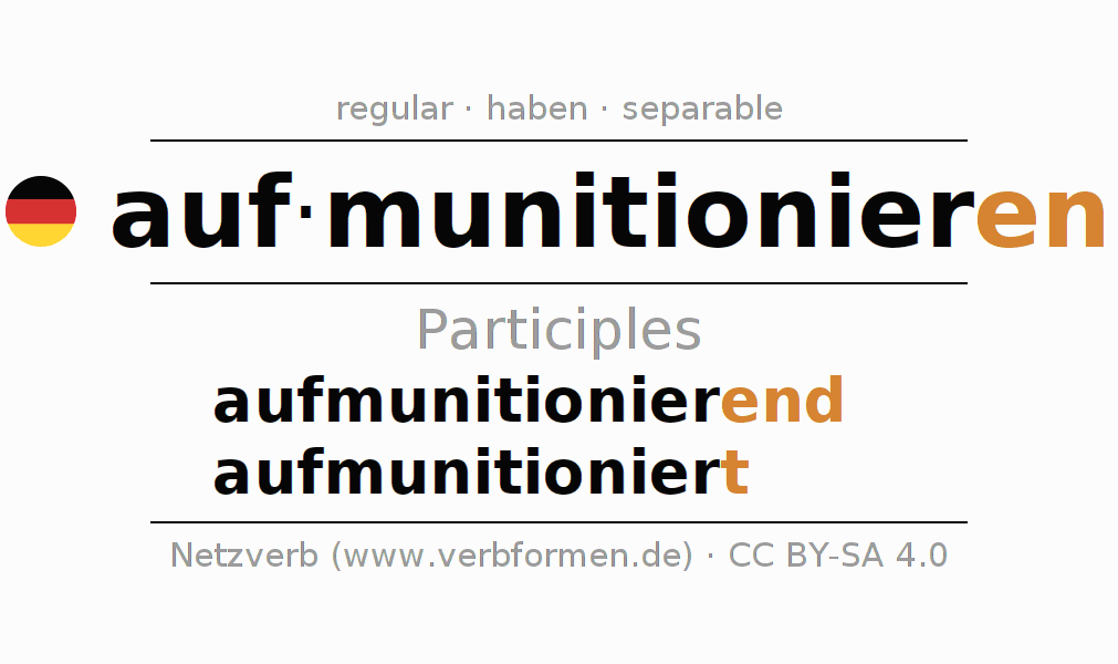 The conjugation of aufmunitionieren in Participle Present Perfect part of speech Active is aufmunitionierend, aufmunitioniert.The conjugation corresponds to certain grammatical rules. Likewise the requirements for the conjugation of the simple verb forms of aufmunitionieren in Participle. Comments ☆