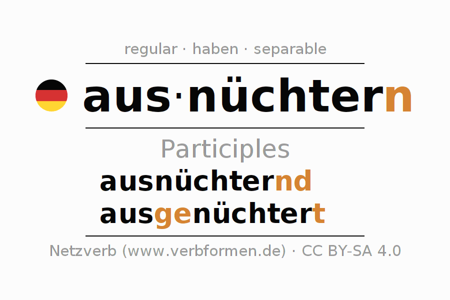 The conjugation of ausnüchtern in Participle Present Perfect part of speech Active is ausnüchternd, ausgenüchtert.The conjugation corresponds to certain grammatical rules. Likewise the requirements for the conjugation of the simple verb forms of ausnüchtern in Participle. Comments ☆
