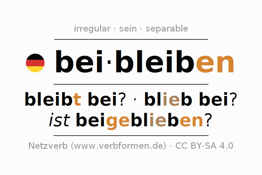 The conjugation of beibleiben in Participle Present Perfect part of speech Active is beibleibend, beigeblieben.The conjugation corresponds to certain grammatical rules. Likewise the requirements for the conjugation of the simple verb forms of beibleiben in Participle. Comments ☆