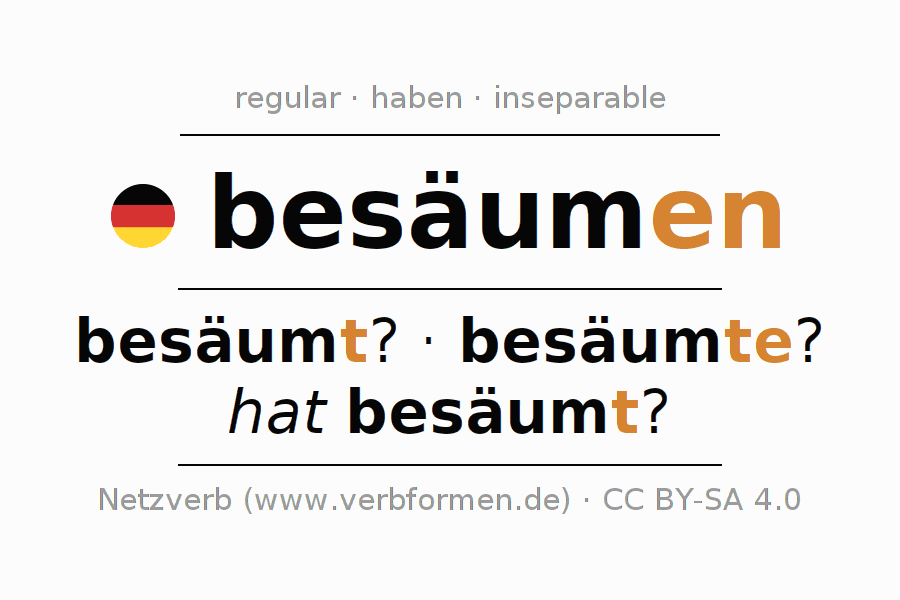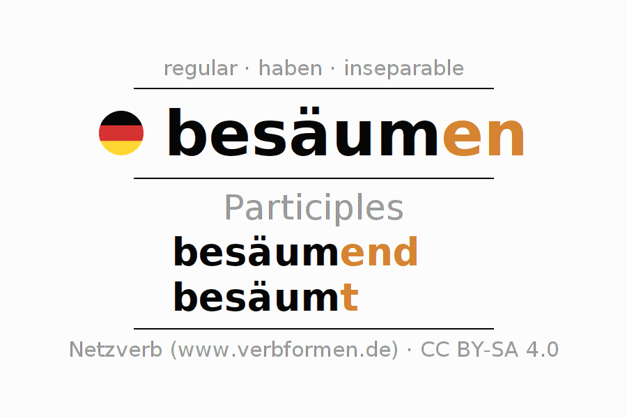 The conjugation of besäumen in Participle Present Perfect part of speech Active is besäumend, besäumt.The conjugation corresponds to certain grammatical rules. Likewise the requirements for the conjugation of the simple verb forms of besäumen in Participle. Comments ☆