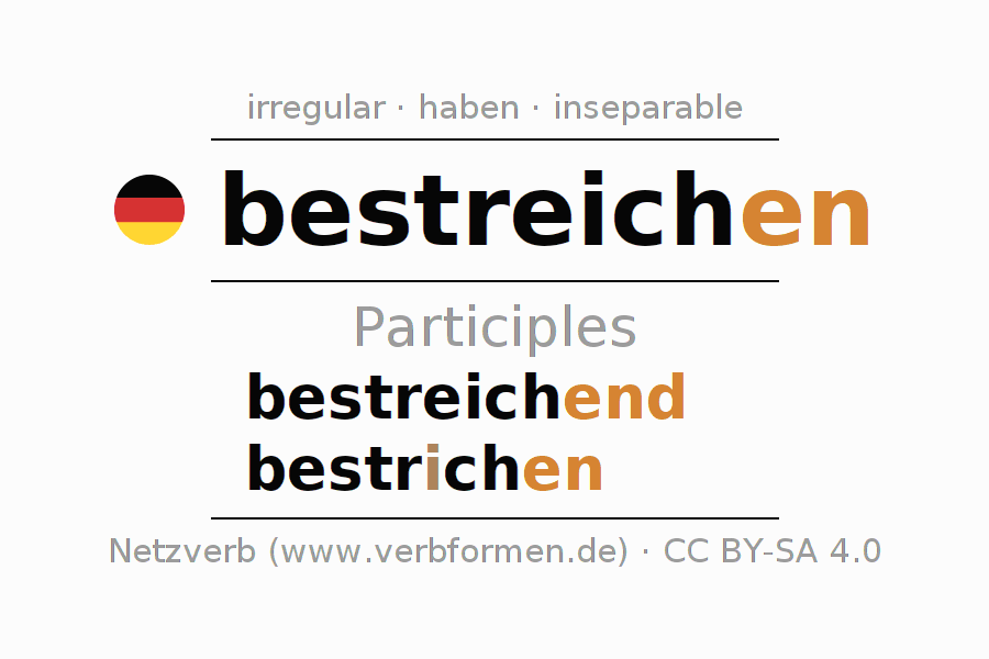The conjugation of bestreichen in Participle Present Perfect part of speech Active is bestreichend, bestrichen.The conjugation corresponds to certain grammatical rules. Likewise the requirements for the conjugation of the simple verb forms of bestreichen in Participle. Comments ☆