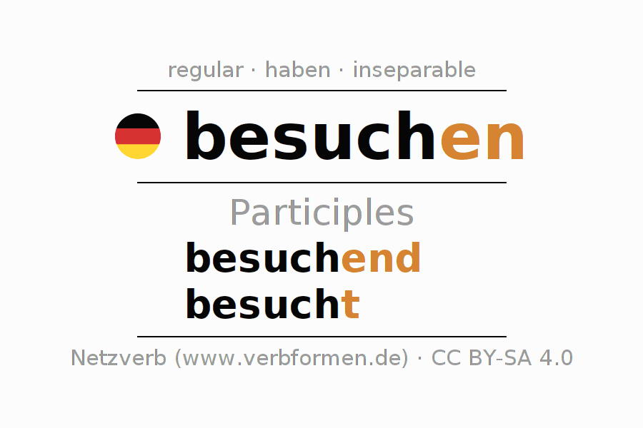 The conjugation of besuchen in Participle Present Perfect part of speech Active is besuchend, besucht.The conjugation corresponds to certain grammatical rules. Likewise the requirements for the conjugation of the simple verb forms of besuchen in Participle. Comments ☆