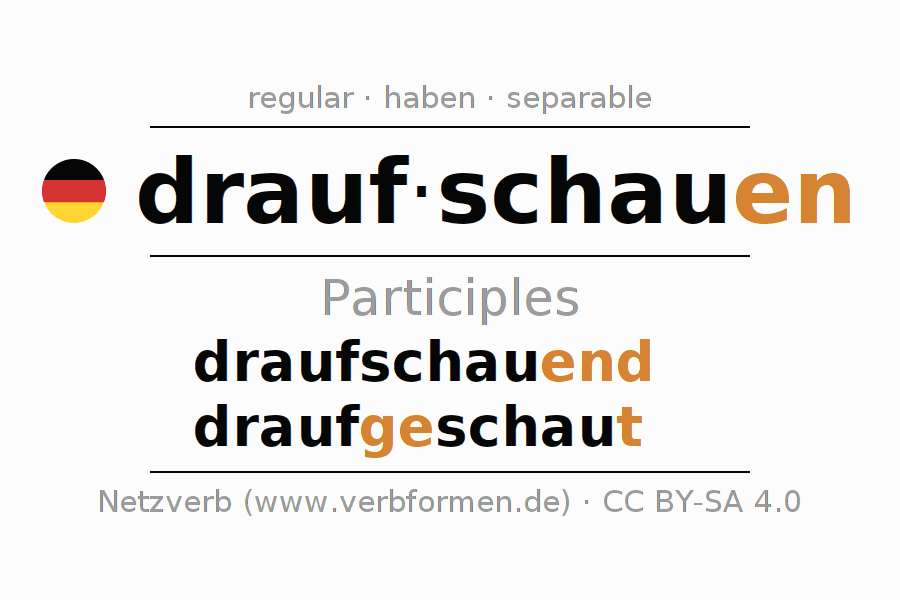The conjugation of draufschauen in Participle Present Perfect part of speech Active is draufschauend, draufgeschaut.The conjugation corresponds to certain grammatical rules. Likewise the requirements for the conjugation of the simple verb forms of draufschauen in Participle. Comments ☆