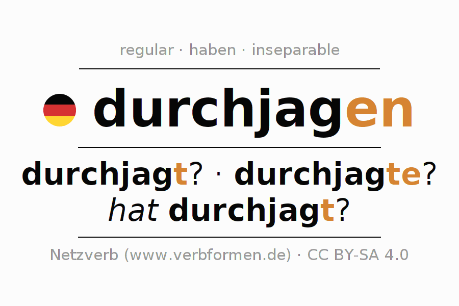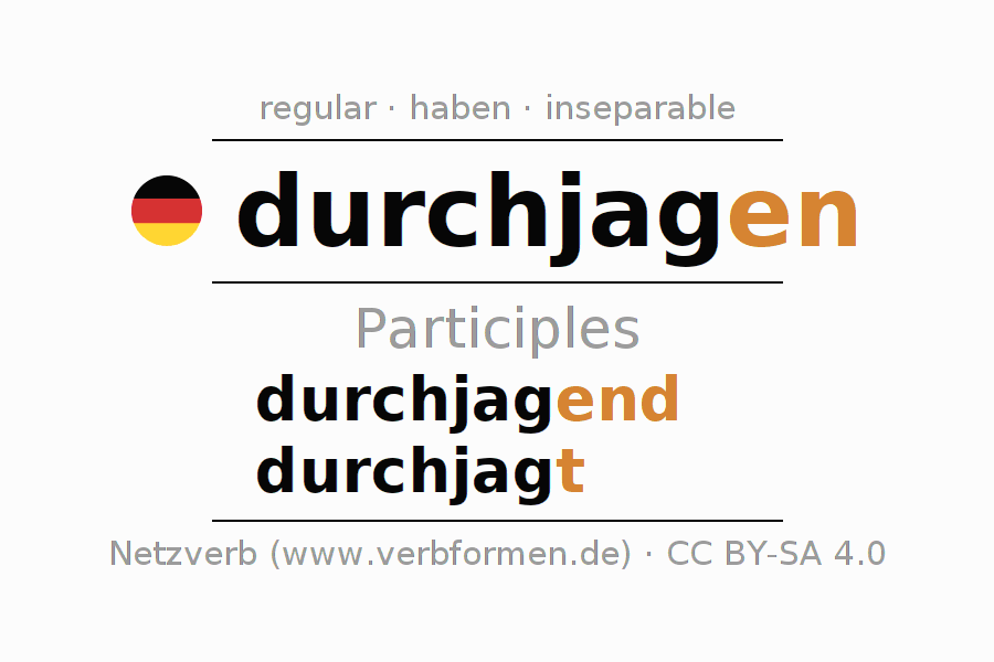 The conjugation of durchjagen in Participle Present Perfect part of speech Active is durchjagend, durchjagt.The conjugation corresponds to certain grammatical rules. Likewise the requirements for the conjugation of the simple verb forms of durchjagen in Participle. Comments ☆