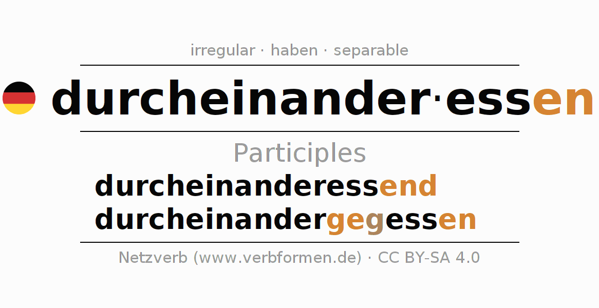 The verb durcheinanderessen fully conjugated in all persons and numbers in the Participle Present Perfect