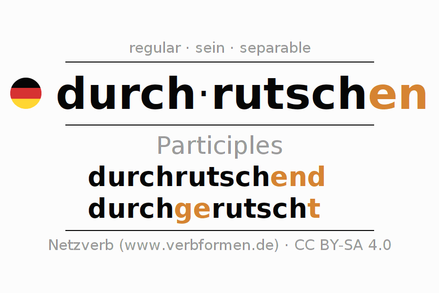 The conjugation of durchrutschen in Participle Present Perfect part of speech Active is durchrutschend, durchgerutscht.The conjugation corresponds to certain grammatical rules. Likewise the requirements for the conjugation of the simple verb forms of durchrutschen in Participle. Comments ☆