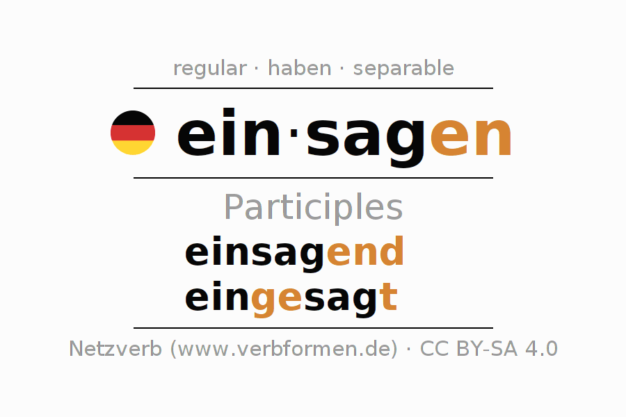 The conjugation of einsagen in Participle Present Perfect part of speech Active is einsagend, eingesagt.The conjugation corresponds to certain grammatical rules. Likewise the requirements for the conjugation of the simple verb forms of einsagen in Participle. Comments ☆