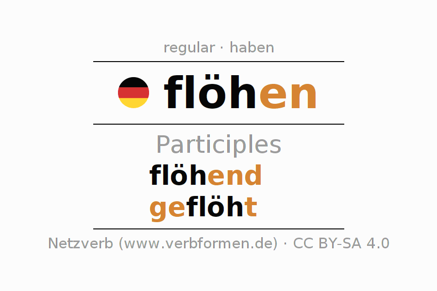 The conjugation of flöhen in Participle Present Perfect part of speech Active is flöhend, geflöht.The conjugation corresponds to certain grammatical rules. Likewise the requirements for the conjugation of the simple verb forms of flöhen in Participle. Comments ☆