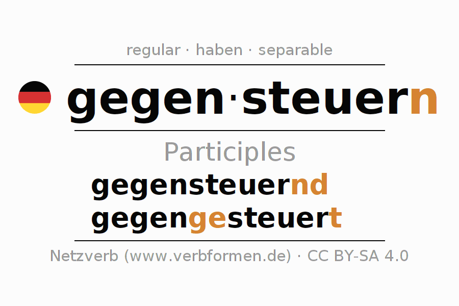 The conjugation of gegensteuern in Participle Present Perfect part of speech Active is gegensteuernd, gegengesteuert.The conjugation corresponds to certain grammatical rules. Likewise the requirements for the conjugation of the simple verb forms of gegensteuern in Participle. Comments ☆