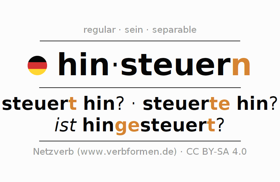 The conjugation of hinsteuern in Participle Present Perfect part of speech Active is hinsteuernd, hingesteuert.The conjugation corresponds to certain grammatical rules. Likewise the requirements for the conjugation of the simple verb forms of hinsteuern in Participle. Comments ☆