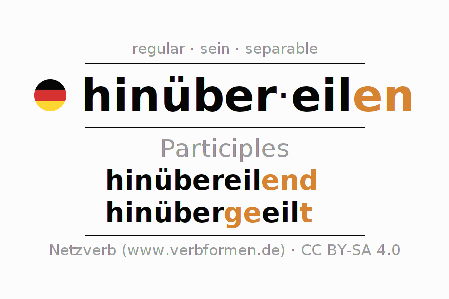 The verb hinübereilen fully conjugated in all persons and numbers in the Participle Present Perfect
