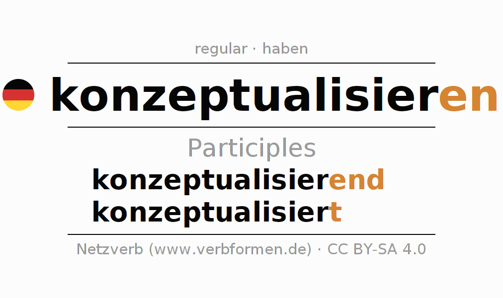 The conjugation of konzeptualisieren in Participle Present Perfect part of speech Active is konzeptualisierend, konzeptualisiert.The conjugation corresponds to certain grammatical rules. Likewise the requirements for the conjugation of the simple verb forms of konzeptualisieren in Participle. Comments ☆