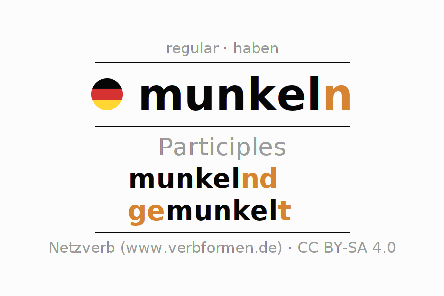 The conjugation of munkeln in Participle Present Perfect part of speech Active is munkelnd, gemunkelt.The conjugation corresponds to certain grammatical rules. Likewise the requirements for the conjugation of the simple verb forms of munkeln in Participle. Comments ☆