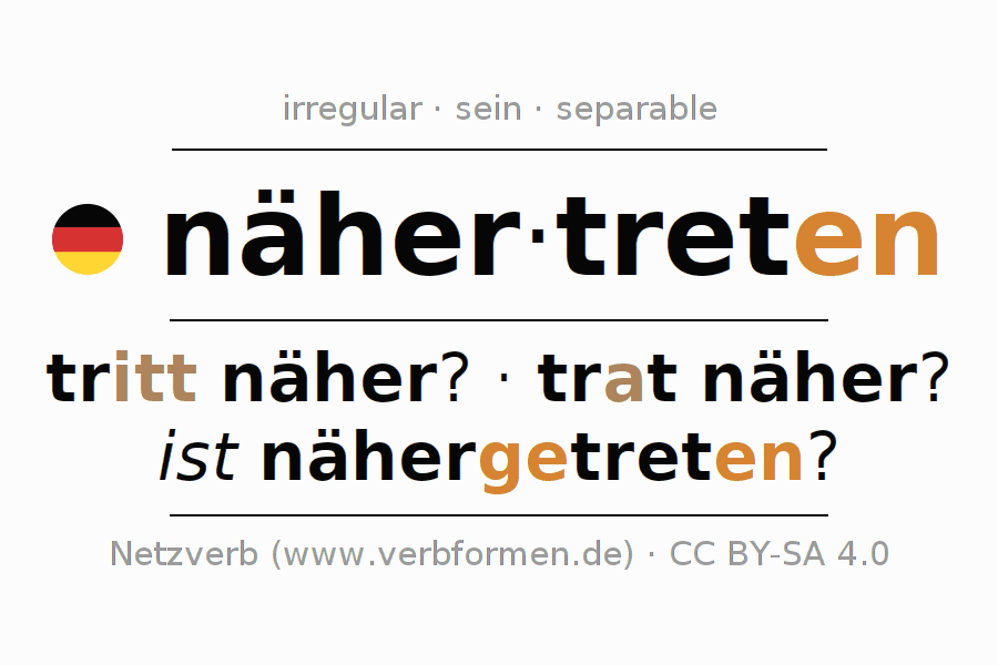 The conjugation of nähertreten in Participle Present Perfect part of speech Active is nähertretend, nähergetreten.The conjugation corresponds to certain grammatical rules. Likewise the requirements for the conjugation of the simple verb forms of nähertreten in Participle. Comments ☆