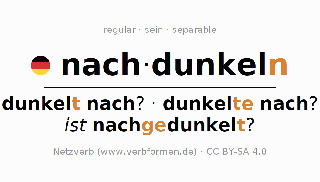 The conjugation of nachdunkeln in Participle Present Perfect part of speech Active is nachdunkelnd, nachgedunkelt.The conjugation corresponds to certain grammatical rules. Likewise the requirements for the conjugation of the simple verb forms of nachdunkeln in Participle. Comments ☆