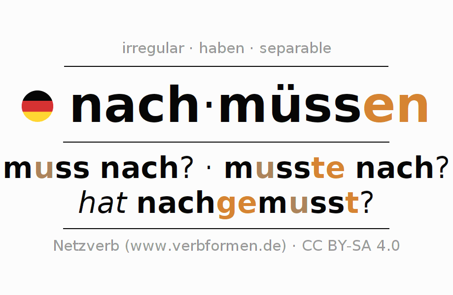 The conjugation of nachmüssen in Participle Present Perfect part of speech Active is nachmüssend, nachgemusst.The conjugation corresponds to certain grammatical rules. Likewise the requirements for the conjugation of the simple verb forms of nachmüssen in Participle. Comments ☆