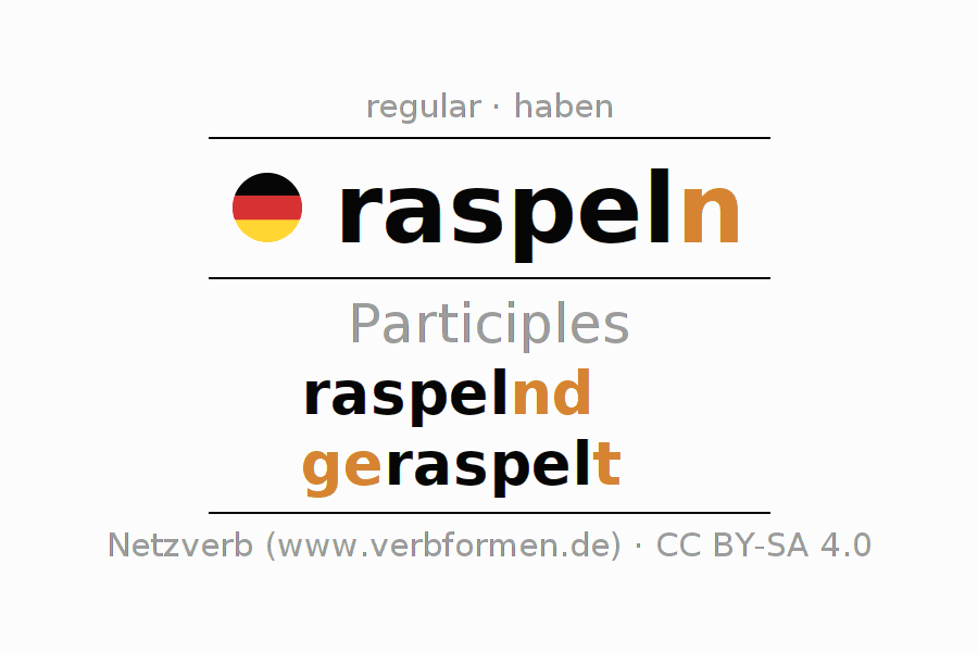 The conjugation of raspeln in Participle Present Perfect part of speech Active is raspelnd, geraspelt.The conjugation corresponds to certain grammatical rules. Likewise the requirements for the conjugation of the simple verb forms of raspeln in Participle. Comments ☆