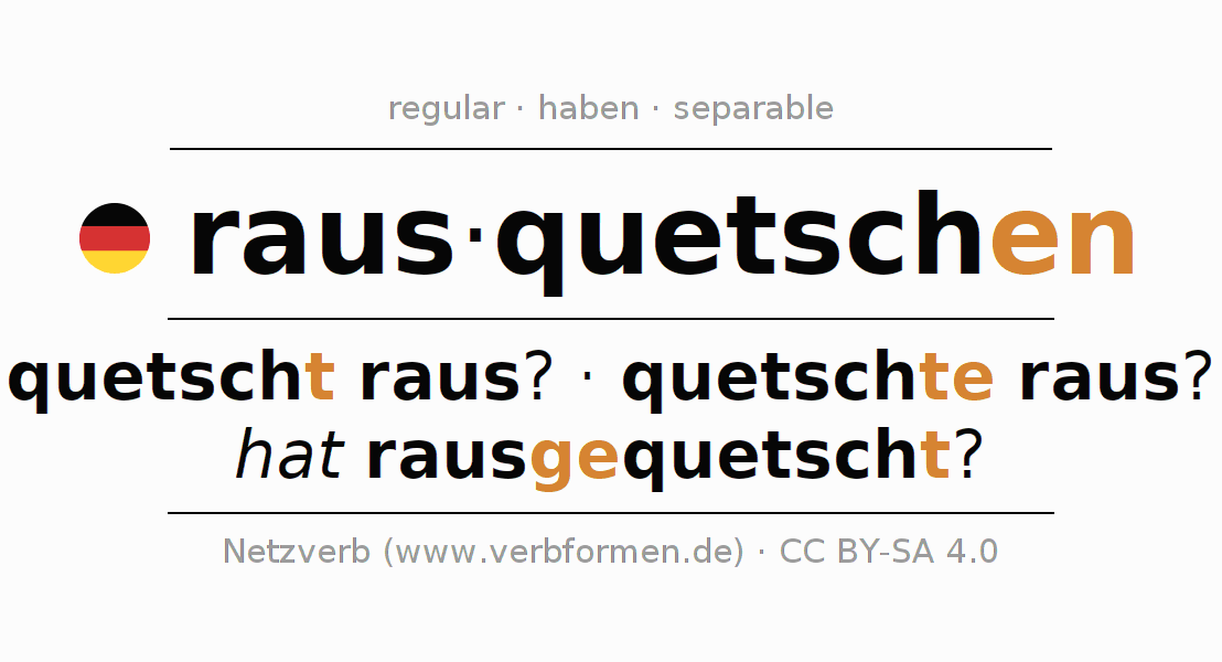 The conjugation of rausquetschen in Participle Present Perfect part of speech Active is rausquetschend, rausgequetscht.The conjugation corresponds to certain grammatical rules. Likewise the requirements for the conjugation of the simple verb forms of rausquetschen in Participle. Comments ☆