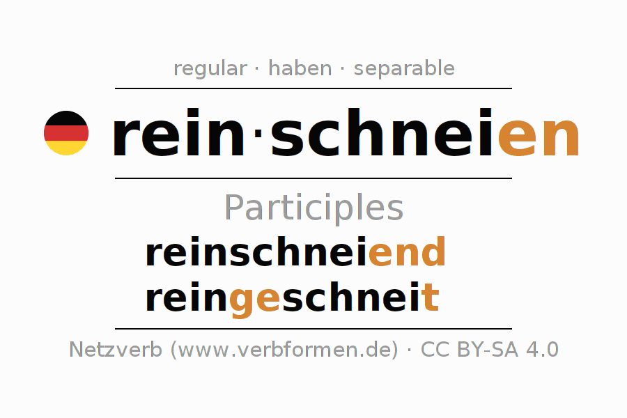 The conjugation of reinschneien in Participle Present Perfect part of speech Active is reinschneiend, reingeschneit.The conjugation corresponds to certain grammatical rules. Likewise the requirements for the conjugation of the simple verb forms of reinschneien in Participle. Comments ☆