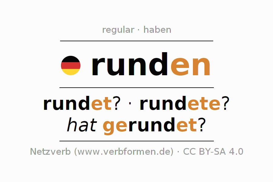 The conjugation of runden in Participle Present Perfect part of speech Active is rundend, gerundet.The conjugation corresponds to certain grammatical rules. Likewise the requirements for the conjugation of the simple verb forms of runden in Participle. Comments ☆