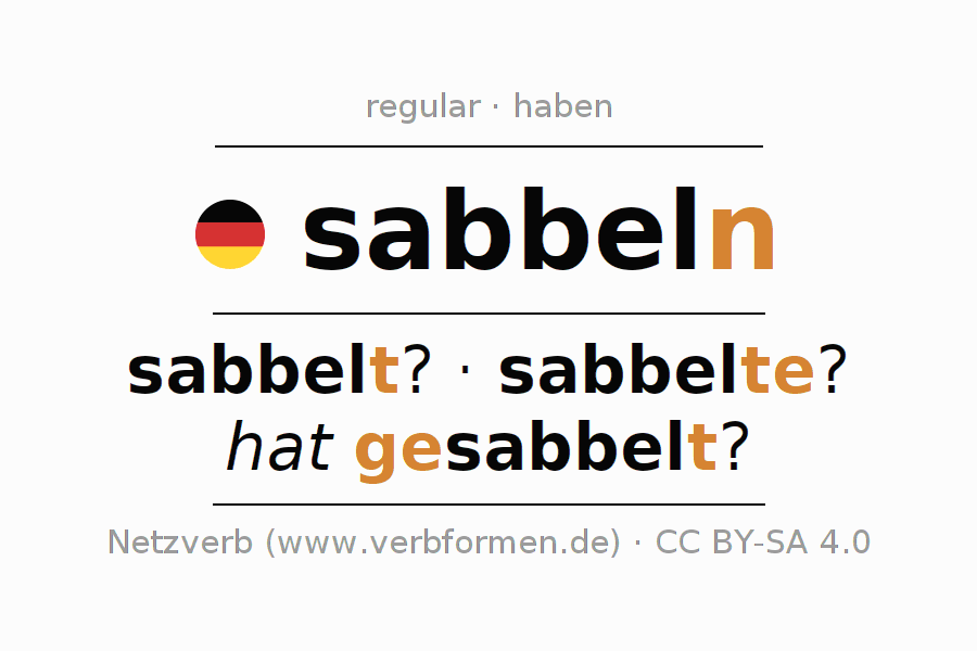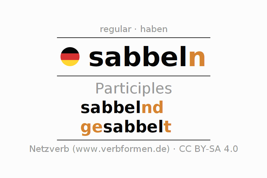The conjugation of sabbeln in Participle Present Perfect part of speech Active is sabbelnd, gesabbelt.The conjugation corresponds to certain grammatical rules. Likewise the requirements for the conjugation of the simple verb forms of sabbeln in Participle. Comments ☆
