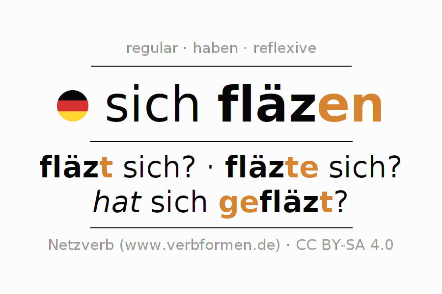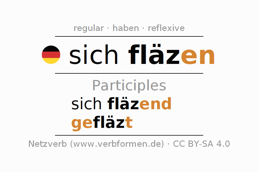 The conjugation of sich fläzen in Participle Present Perfect part of speech Active is sich fläzend, gefläzt.The conjugation corresponds to certain grammatical rules. Likewise the requirements for the conjugation of the simple verb forms of fläzen in Participle. Comments ☆