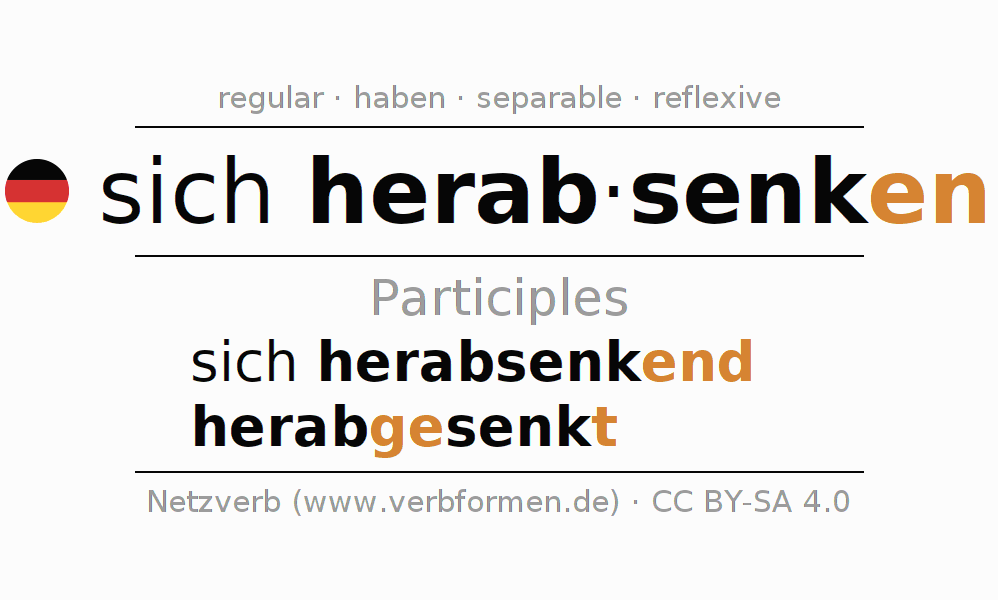The verb sich herabsenken fully conjugated in all persons and numbers in the Participle Present Perfect