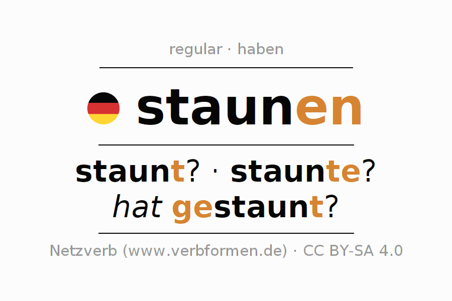 The conjugation of staunen in Participle Present Perfect part of speech Active is staunend, gestaunt.The conjugation corresponds to certain grammatical rules. Likewise the requirements for the conjugation of the simple verb forms of staunen in Participle. Comments ☆