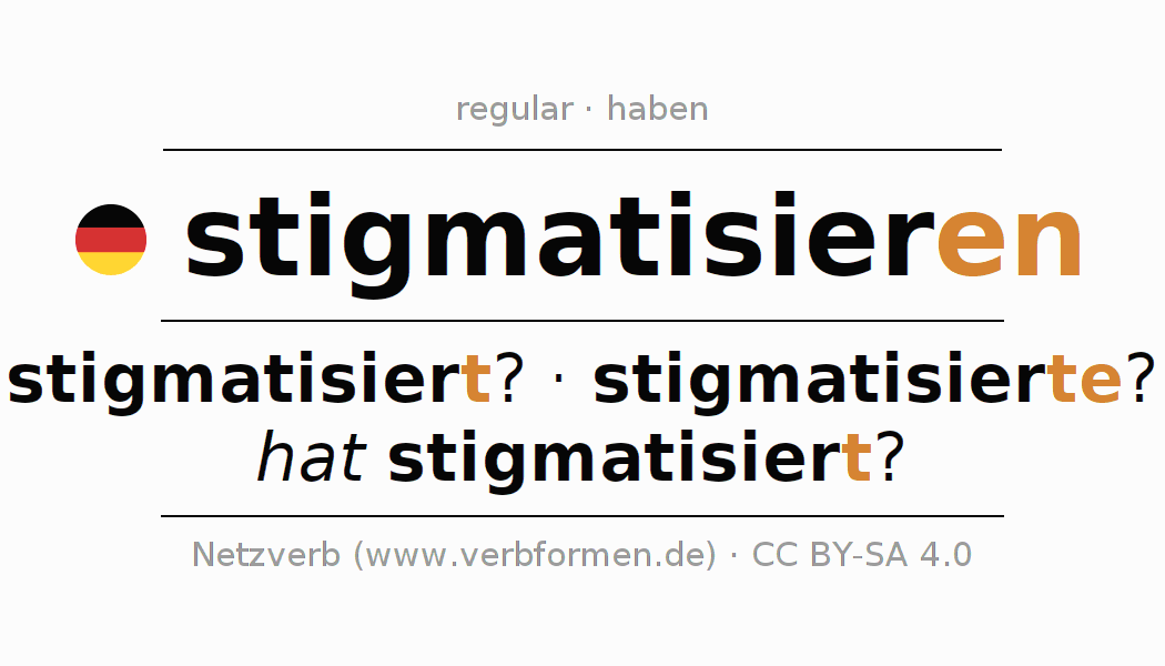 The conjugation of stigmatisieren in Participle Present Perfect part of speech Active is stigmatisierend, stigmatisiert.The conjugation corresponds to certain grammatical rules. Likewise the requirements for the conjugation of the simple verb forms of stigmatisieren in Participle. Comments ☆