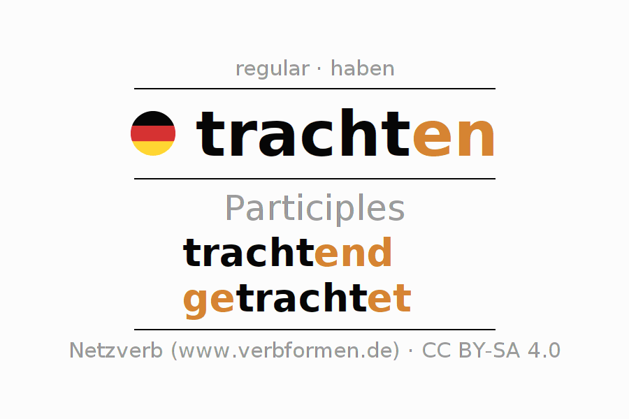 The conjugation of trachten in Participle Present Perfect part of speech Active is trachtend, getrachtet.The conjugation corresponds to certain grammatical rules. Likewise the requirements for the conjugation of the simple verb forms of trachten in Participle. Comments ☆