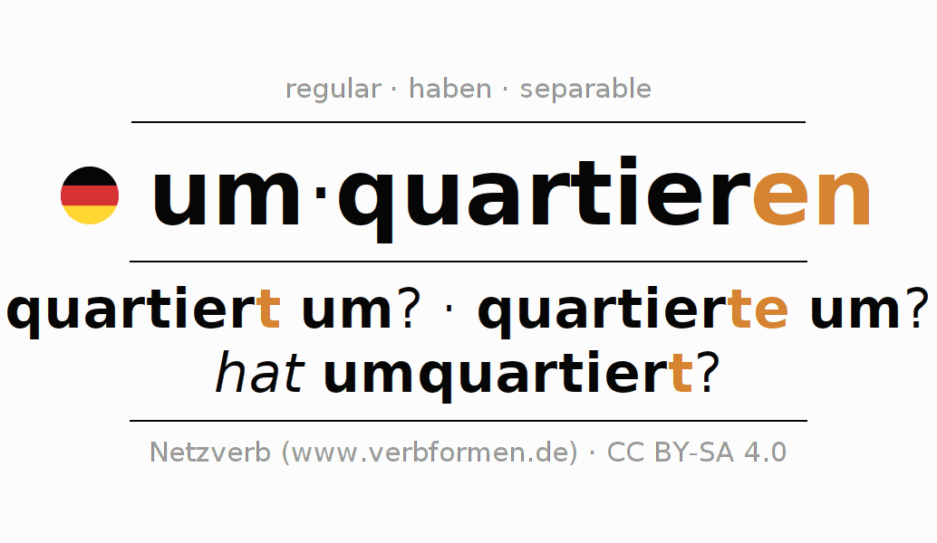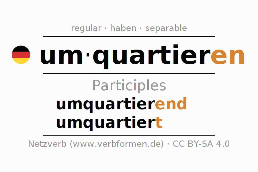 The conjugation of umquartieren in Participle Present Perfect part of speech Active is umquartierend, umquartiert.The conjugation corresponds to certain grammatical rules. Likewise the requirements for the conjugation of the simple verb forms of umquartieren in Participle. Comments ☆