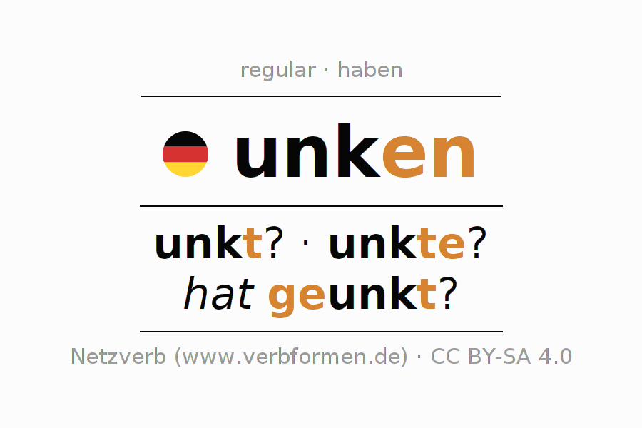 The conjugation of unken in Participle Present Perfect part of speech Active is unkend, geunkt.The conjugation corresponds to certain grammatical rules. Likewise the requirements for the conjugation of the simple verb forms of unken in Participle. Comments ☆